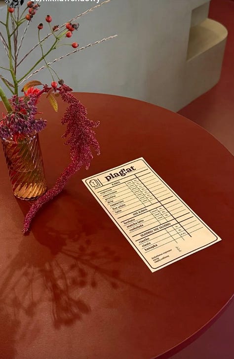 Wnętrze jest minimalistyczne, przytulne i nowoczesne – dominują bordo i beże, drewno oraz stal, a centralny stół z wyrastającym z niego fikusem tworzy charakterystyczny punkt spotkań. Wieczorem oświetlenie zmienia się, wprowadzając ciepłą, kameralną atmosferę. Projekt przestrzeni opracował sam Karol, absolwent architektury, a lokal wciąż jest dopracowywany.